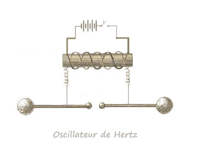 Il utilise une bobine de Ruhmkorff, une batterie et surtout met au point un oscillateur qui permettra de produire une grosse étincelle sur un éclateur constitué de deux sphères. Cela provoque une variation électrique, c’est une oscillation à haute fréquence.